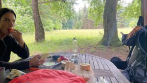 Dann kamen wir in den Oderwald 🌳🌳🌳, da war es auf dem breiten Weg herrlich und auf dem Singletrail entlang der Grenze zwischen „HB“ und „KH“ wurde es noch besser. Pünktlich und zufällig zur Mittagspause kamen wir an eine Jagdhütte mit Bänken und Tisch unter einer Überdachung, an einer malerischen, sonnigen Waldwiese- so schön, dass wir zwei Stunden Pause machten😍.