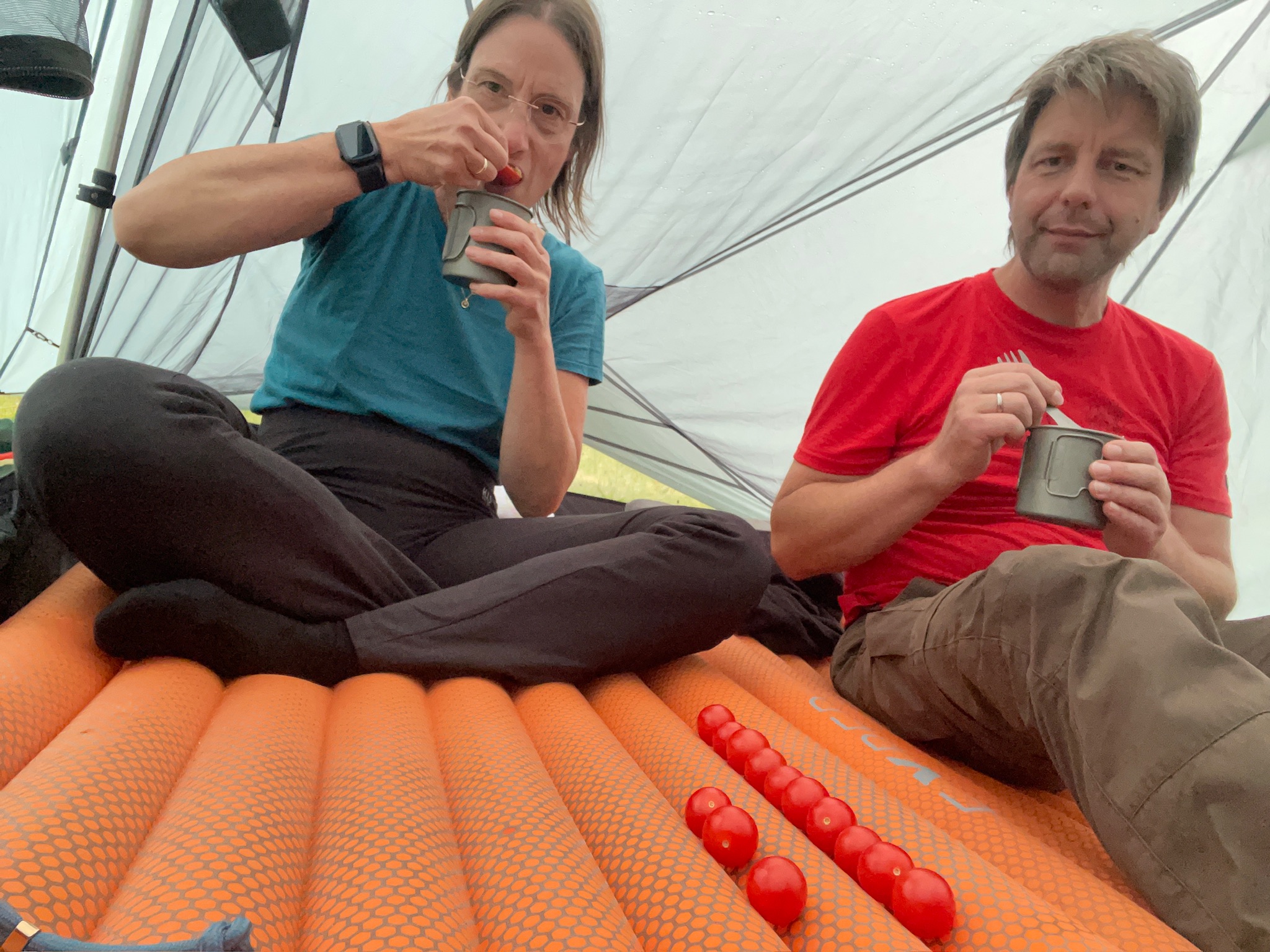 In den Hügeln südwestlich des Oderwalds stürmte auf den Kuppen ein ordentlicher Wind, aber in den Tälern und hinter Waldstücken war es warm. Es begegneten uns Radfahrer, von denen jeder freundlicher grüßte als der davor 😬😊😃. Die letzten Kilometer durch besonders schöne und von zu Hause unterschiedliche Hügellandschaft bis Neuenkirchen zogen sich und zu grauser Letzt führt die Talstraße hier nicht im Tal entlang, sondern vom Dorf ins Tal… wir fanden Richards Obstgarten, in dem wir zelten durften, und schafften es vor dem Regen, das Zelt aufzustellen, Wasser vom Friedhof zu holen, den Kocher in Gang zu bringen und Britta ist auch katzengewaschen… Gegessen haben wir dann nach einigen etwas hektischen letzten Handgriffen und Abspannungen im Zelt. Ging auch.😉