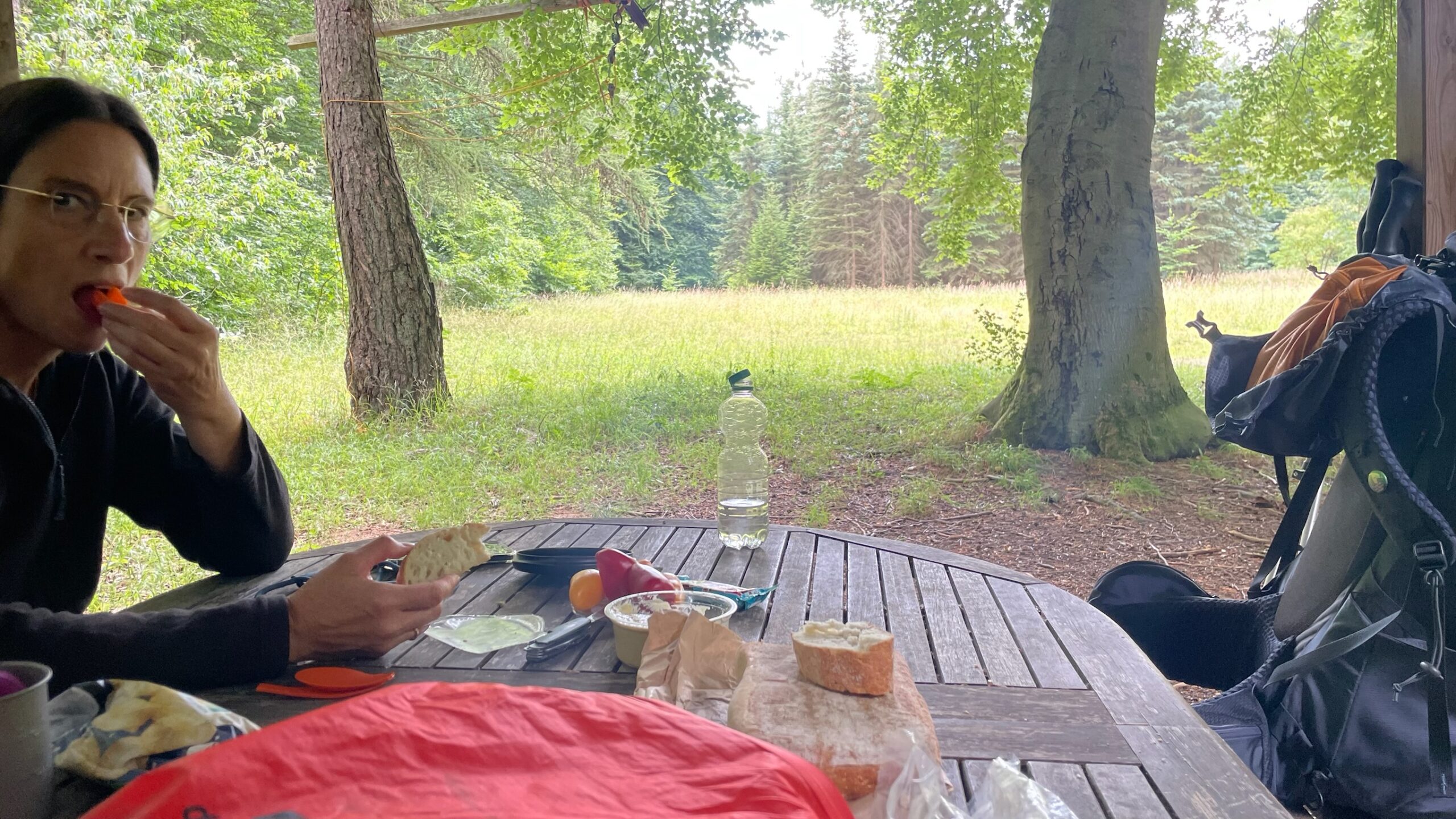 Dann kamen wir in den Oderwald 🌳🌳🌳, da war es auf dem breiten Weg herrlich und auf dem Singletrail entlang der Grenze zwischen „HB“ und „KH“ wurde es noch besser. Pünktlich und zufällig zur Mittagspause kamen wir an eine Jagdhütte mit Bänken und Tisch unter einer Überdachung, an einer malerischen, sonnigen Waldwiese- so schön, dass wir zwei Stunden Pause machten😍.