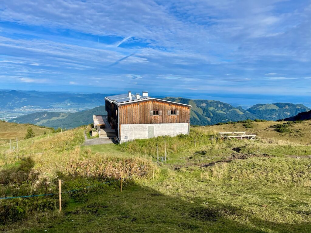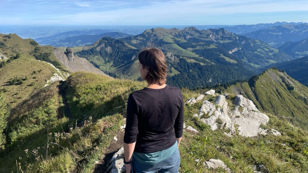 Ein Mitbewohner hatte seine feuchten Turnschuhe im Zimmer, Britta hörte jedem Traumgespräch der beiden Töchter zu, statt zu schlafen. Zum Sonnenaufgang auf den hohen Freschen gingen wir nicht mit. Statt dessen nach dem Frühstück auf die Mathona. Den ganzen Vormittag hatten wir herrliches Wetter und immer wieder den Bodensee und später immer die Mathona und den Freschen im Rückblick.