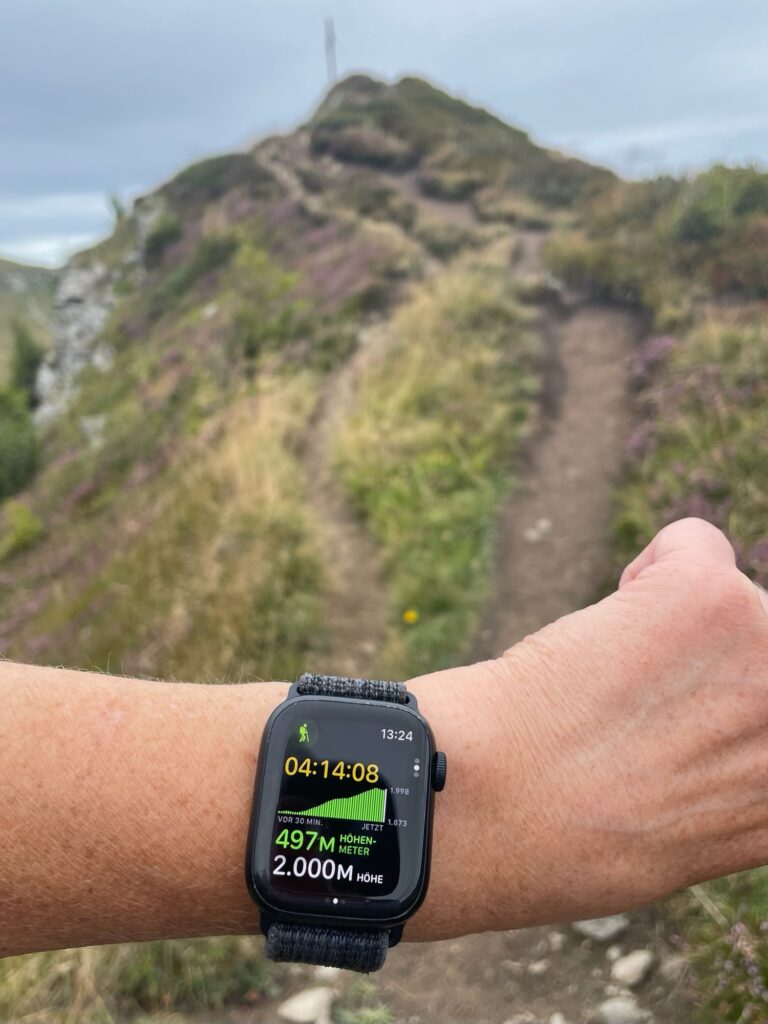 Kurz bevor wir Mittagspause machen wollten, erreichten wir 2000 m Höhe und ca. 50 m Wegs weiter den Gipfel des Portlahorns mit 2010 m. Als wir davon abgestiegen waren, gerieten wir fast in eine liebestolle Kuhherde, die wir dann doch lieber vermieden.