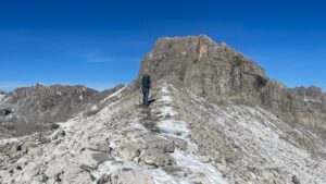 Ich hoffe, dass die Abnahme der Essensqualität sich nicht von Hütte zu Hütte fortsetzt. (Das eine, pro Person zugeteilte Brötchen heute morgen erfüllte seine Aufgabe als Platzkarte besser als die als Speise) Vor der Hütte war großes Gewimmel, aber trotz unserer üblichen Bummelei gingen wir als zweite Gruppe in Richtung Freiburger Hütte los. Nach und nach ließen wir uns aber von allen überholen, dass sie uns nicht im Nacken sitzen sollten.