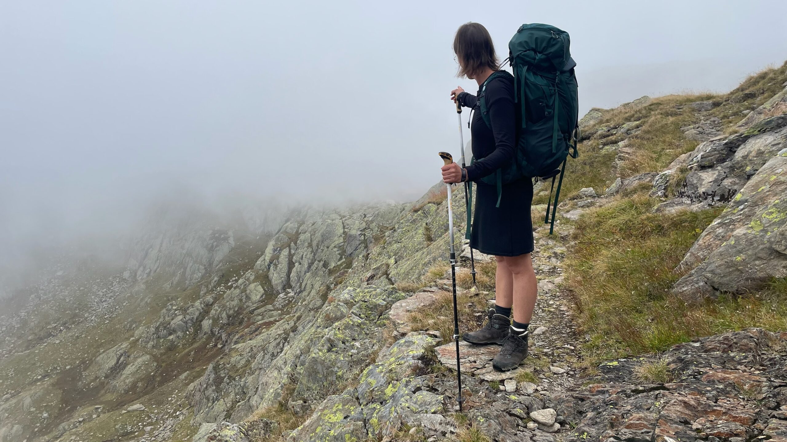 Der Abstieg von der Reutlinger Hütte begann ziemlich spannend und ausgesetzt, als der Pfad ein bisschen breiter wurde erreichten uns die Wolken, die von hinten angesaust kamen. 💨