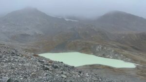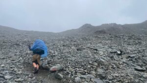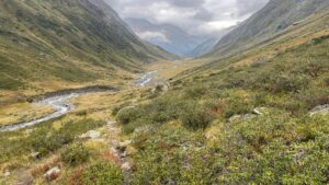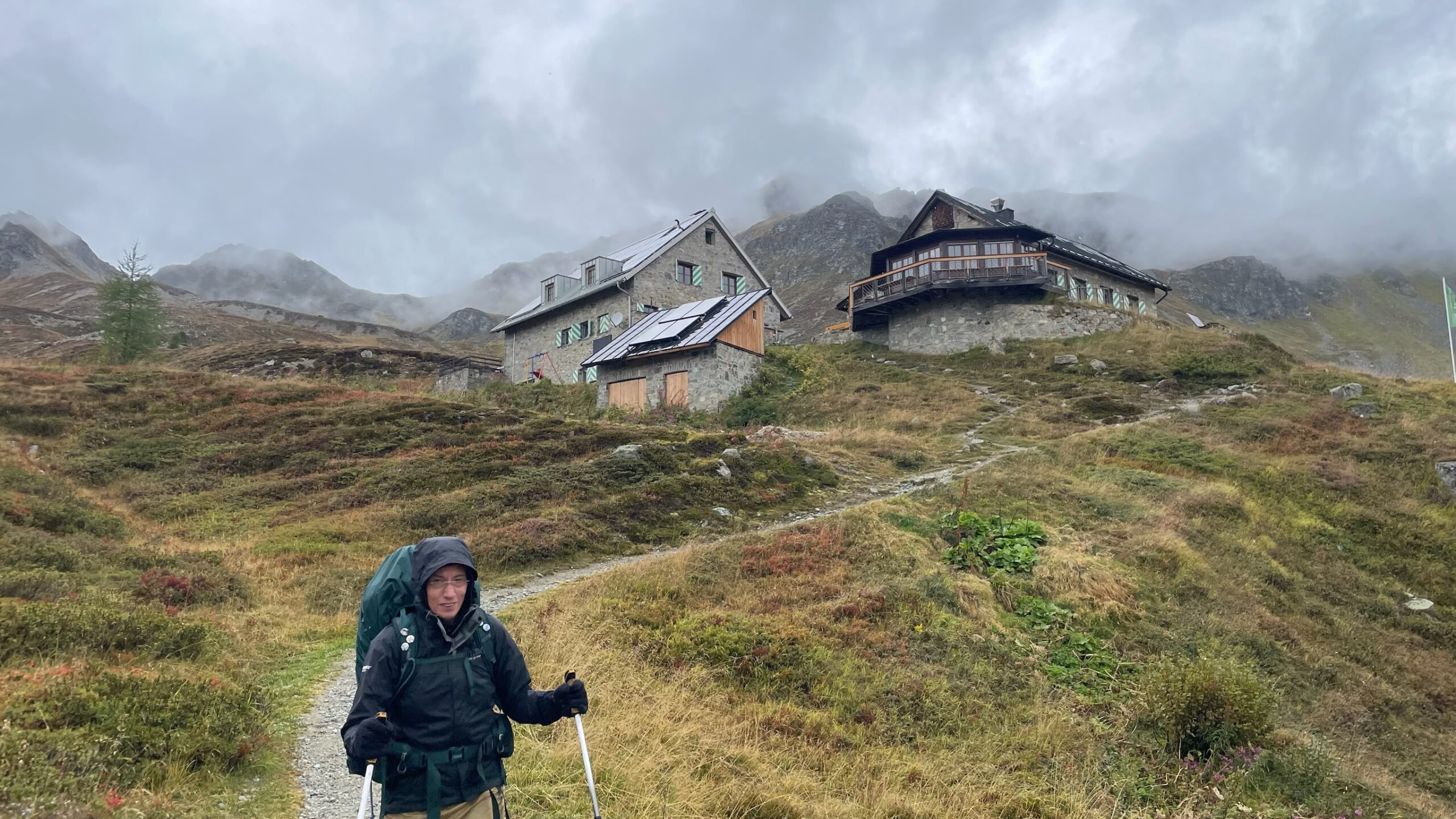 In der Konstanzer Hütte haben wir beide schlecht geschlafen und uns gewundert, wie viele Menschen sich um 7 schon vor der Tür zum Frühstücksraum Schlange standen. Wir kamen trotzdem nicht als letzte los. Durch das Fasultal ging es ganz gemütlich und noch trocken, gegen Ende, als wir zwischen den Galloways hindurch gingen, begann es zu regnen, leider hörte es erst auf der anderen Seite des Jochs wieder auf, zunächst wurde es immer nasser, kälter und stürmischer. Brittas Finger froren wieder ein, 🥶 wir konnten uns eher nicht mehr unterhalten oder auf den Gletscher auf dem Nachbarberg hinweisen. Mit Mühe konnten wir vermeiden, vom Schafbüheljoch geweht zu werden. 🪁