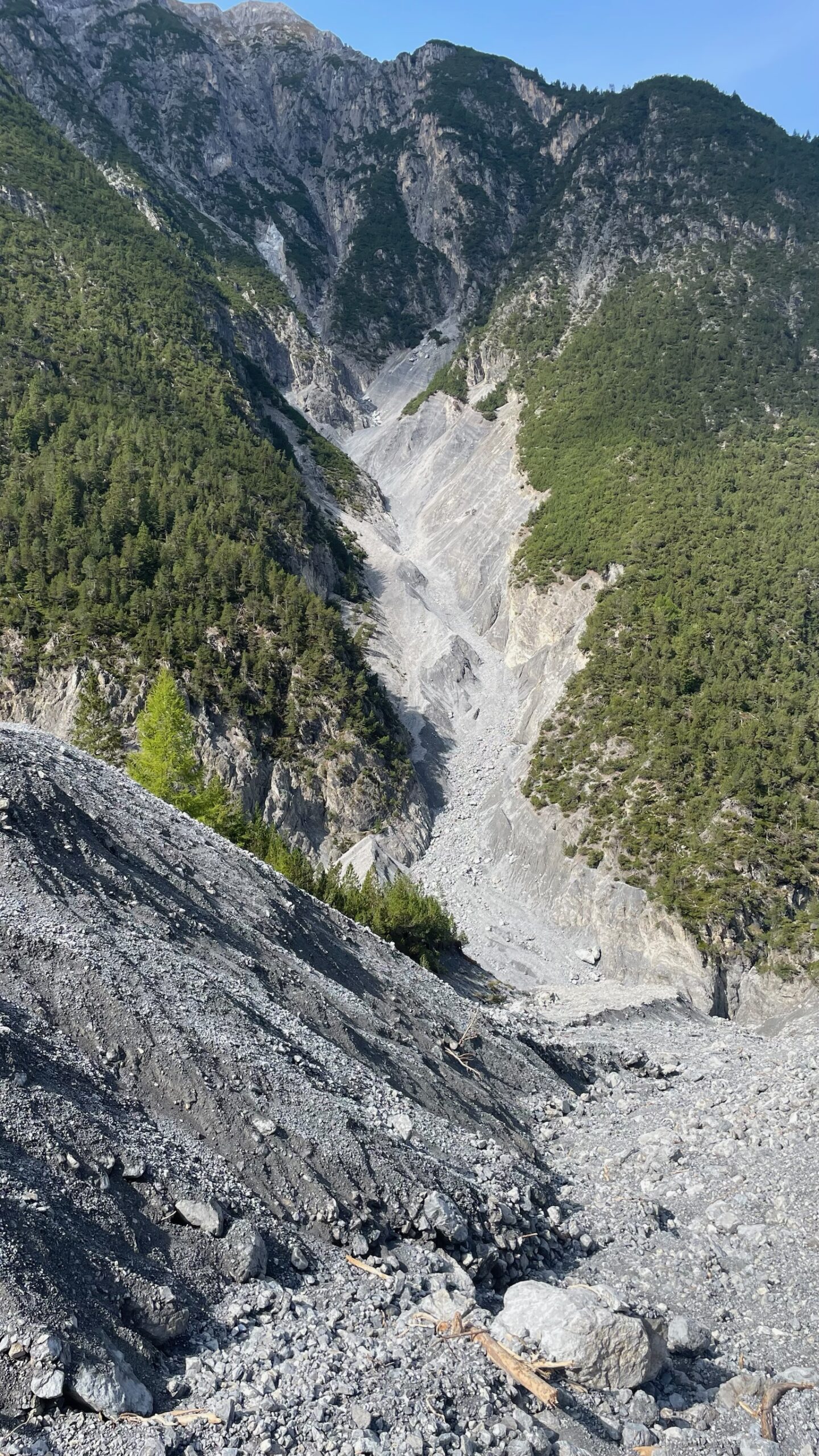 Das Val S-charl und der Bach darin sind beeindruckend schroff, tosend und schotterig, aber mit lauter riesigen Spuren von Hangrutschungen und eingerichteter „sicherer Stellen bei Hangrutschgefahr“ auch erschreckende Zeichen der Klimakatastrophe.