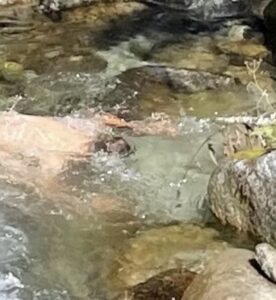 Kurz vor Mittagspause waren wir ca. 2,5 km in den Nationalpark Adamello-Brenta gewandert und kamen mal wieder über den einen und anderen superklaren Bach. Da auf die Brücken auch immer die Sonne schien, war der zweite Bach derjenige, in dessen Gumpen erst ich und dann auch Britta zur maximalen Erfrischung untertauchten.