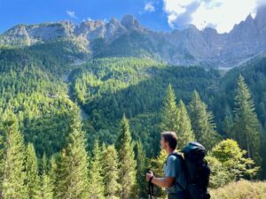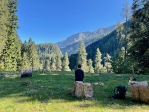 Ab Folgarida wurde der Weg deutlich ebener und ein entspannter Wanderweg. Bananenpause machten wir auf einer verlassenen, „gestuften“ Kuhwiese: wir saßen auf einem oberen, ebenen Stück, das untere Ebene Stück liegt ca. 20 m tiefer. Uns begegneten einige wenige Radfahrer.