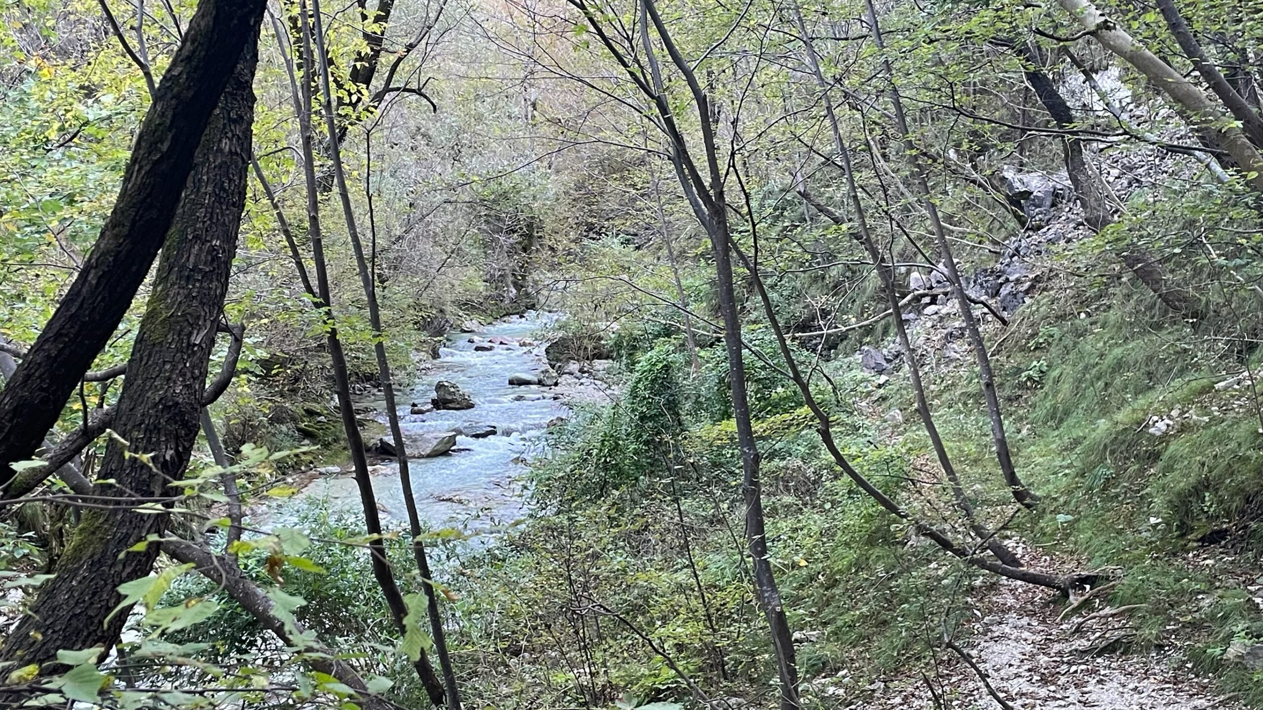 Auf dem ‚Sentiero dell‘Arte‘ kamen wir durch ein fast schon bizarres Gelände mit lauter großen und riesigen Bouldern, die offenbar in den letzten Jahrzehnten oder Jahrhunderten von der darüber aufragenden Felswand abgebrochen waren. Vorbei am bewohnten und etwas abweisenden Castel Pietra und einigen Wasserfällen kamen wir unterhalb des beeindruckenden Castel Beseno vorbei. Der Rio Cavallo ist dort direkt erreichbar und wunderschön (weiter oben ist der Fluss so tief und eng eingeschnitten, dass die Wege weit oberhalb verlaufen).