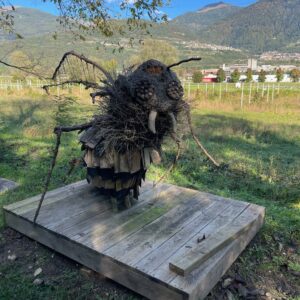 Zuerst sind die Via Romea und der Valsugana-Radweg eh das gleiche und es geht mit sanftem Gefälle (hier wirklich) an der Brenta entlang, teilweise parkähnlich, mit Land-art-ähnlichen Installationen zur „Reise des Froschs“.