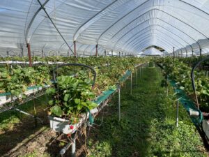 Etwas weiter flussabwärts wieder mal Erdbeerfelder, wobei die Beeren hier unter Folie und in ergonomischer Höhe auf Tischen angebaut werden.