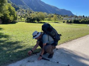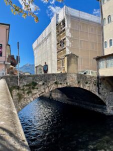 Was wir außerdem deutlich wahrnahmen, war der Verkehrslärm und überhaupt die vielen Geräusche von dieser dichter besiedelten Gegend. Da sich die Via Romea hier den Weg mit den Fahrradfahrern teilt, hatten wir heute sehr viele Begegnungen mit Radlern. Wir trafen auch eine ganze Schulklasse, die wohl einen Ausflug machte. Wir trafen sie sogar mehrere Male, weil sie zwischendurch immer wieder anhalten mussten und uns dann wieder überholten. Auf der flachen Strecke kamen wir heute so zügig voran, dass wir daher schon am frühen Nachmittag unser heutiges Etappenziel Borgo Valsugana (auch: Burg im Suganertal) erreichten. Vorm Rathaus entdeckten wir auch wieder die Schülergruppe, die auf Einlass wartete. Bestimmt wollten die, so wie wir, eigentlich auch lieber in eine Eisdiele einkehren aber alle Eisdielen und auch die Konditorei hatten heute leider Ruhetag. Und zu allem Überfluss hatte der Supermarkt zu dieser Zeit Mittagspause 🙄 Um Einlass in unsere heutige Unterkunft zu erlangen, rief ich den Vermieter Lorenzo an, der uns seine Mutter mit dem Schlüssel vorbei schickte. An dieser Stelle beginnt oder endet eine Reihe von glücklichen Zufällen. Wir hatten in der letzten Woche sehr ausgiebig und lange nach einer Unterkunft in Tezze, unserem von hier nächsten Etappenziel, gesucht. Aber so sehr wir uns auch anstrengten, konnten wir nichts finden. Wir hatten mehrere Möglichkeiten überlegt, was wir nun tun können. Unter anderem hatte Helge auch einen Fahrradladen angeschrieben, weil wir uns dort Fahrräder ausleihen wollten, um die Doppeletappe damit zurückzulegen. Leider gab es von Seiten des Fahrradladens aber nur die Möglichkeit, die Fahrräder erst nach vier Etappen zurückzugeben, was mir nicht gefiel, weil ich nicht so plötzlich aus den Alpen hinaus radeln, sondern dem Ende lieber ausgiebig entgegen fiebern wollte. Während wir noch unsere Möglichkeiten überlegten stellte ich fest, dass diese hier gebuchte Unterkunft ja genau neben einem Bahnhof liegt. Wenn das nicht das erste Glück ist! So entstand also der Plan, die Bahn zu nutzen. Das zweite Glück ist, dass das Etappenziel Tezze ebenfalls einen Bahnhof hat. Wir können morgen also bis dort gehen und dann mit der Bahn hierher zurück fahren, um zu übernachten und übermorgen wieder die Bahn nach Tezze nehmen und unseren Weg von dort weiter gehen. Das dritte Glück ist, dass die Strecke von hier bis Tezze so ziemlich die einzige in diesem Tal ist, die noch vom Zug befahren wird, da überall wegen Brückenbauarbeiten und anderer Renovierungsarbeiten auf Schienenersatzverkehr ausgewichen wird. Das vierte Glück ist Lorenzos Mama, die uns heute den Schlüssel für die Wohnung brachte und zufällig Ticket-Verkäuferin bei der Bahn ist. Sie hat uns angeboten, uns morgen mit den Bahntickets und dem Fahrplan zu helfen.